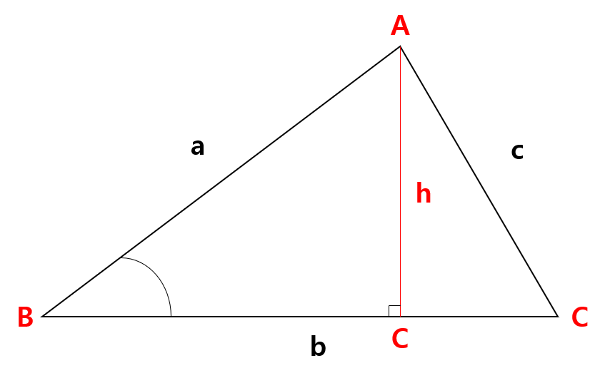 이 삼각형에서 밑면의 길이는 b가 될 것이고 높이 h는 삼각함수 법칙에 의하여 아래와 같이 표현할 수 있다.