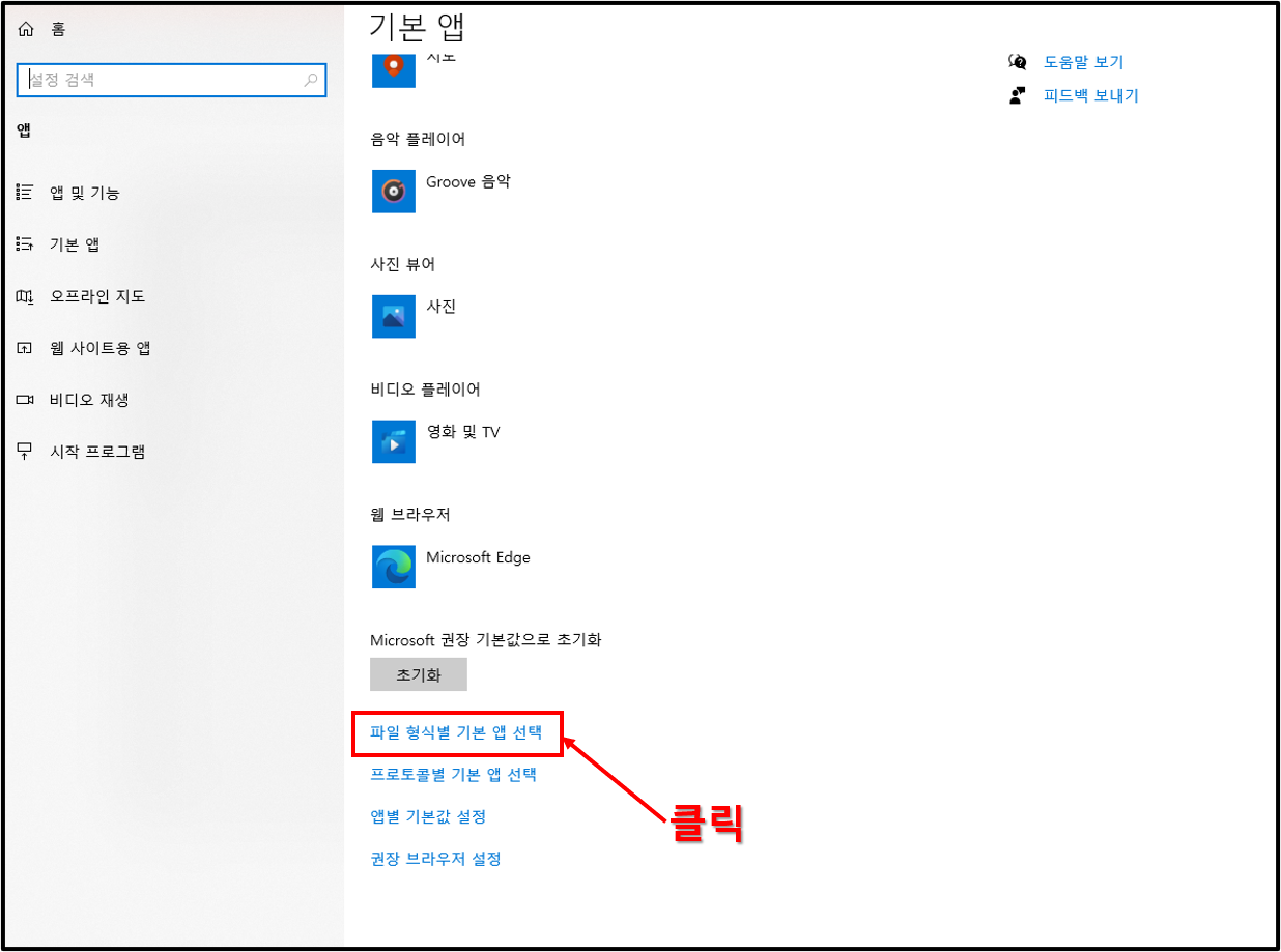 ▲기본 앱을 누르고 스크롤로 밑으로 내려보면 파일 형식별 기본 앱 선택이 있다. 이것을 눌러주자.