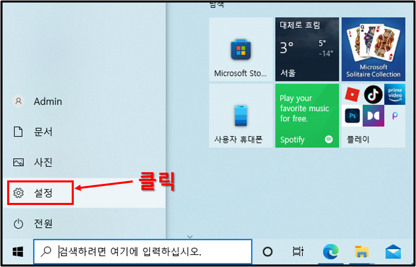 제목이 설정이니 만큼 설정항목으로 들어가 줘야 한다. 설정 항목으로 들어가는 방법은 여러 가지 있지만 시작 버튼을 누름으로써 간단하게 들어갈 수 있다.
