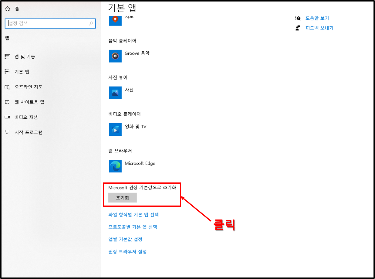 ▲하나하나 찾기 귀찮고 그냥 처음부터 새롭게 기본 앱 설정을 하고 싶다면 사진에 보이는 것과 같이 초기화를 눌러주면 된다. 초기화 버튼은 파일 형식별 기본 앱 선택이 있는 곳에 같이 사이좋게 있다.