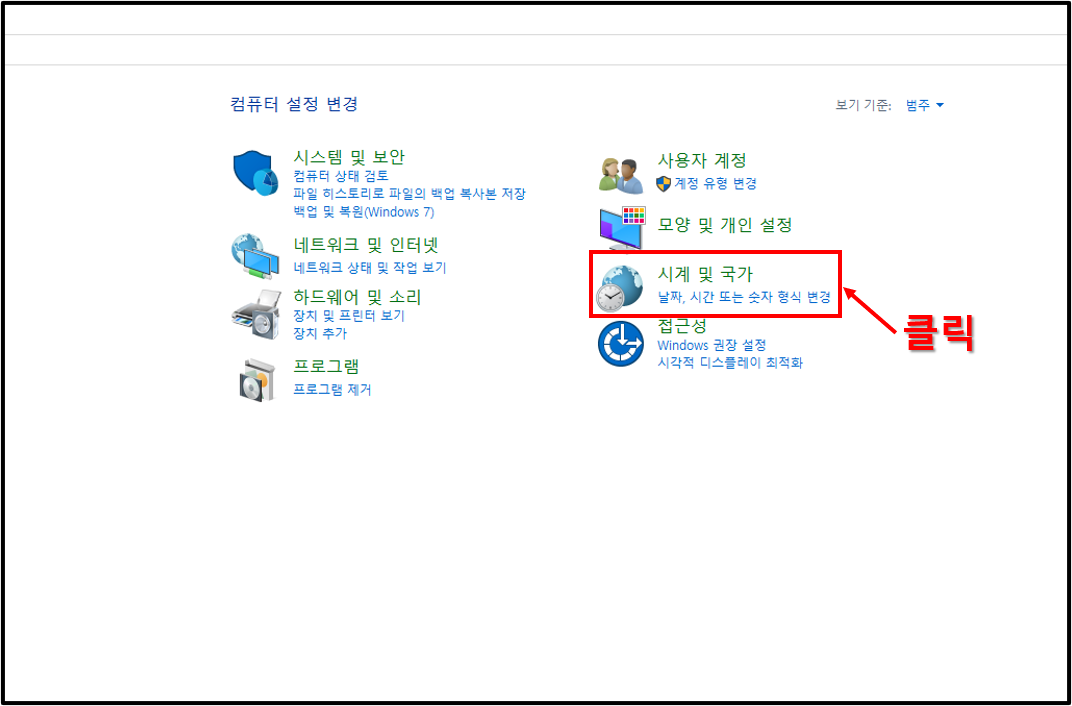 ▲제어판으로 들어왔다. 이름답게 여러 가지 설정들을 바꿀 수 있는 항목들이 보인다. 여기서 오른쪽 편에 있는 시계 및 국가를 클릭해주자.