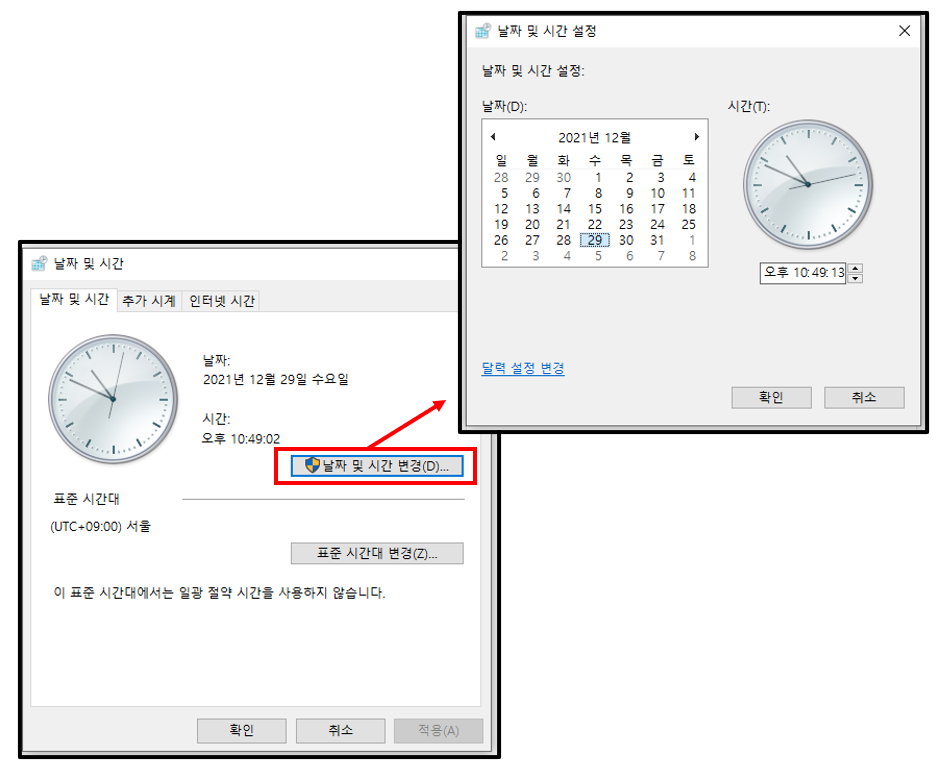 ▲눌러준다면 현재 표시된 시간과 또 기타 여러 가지 항목이 뜬다. 여기서 기본적으로 컴퓨터에서 표시되는 시간은 서울을 기준으로 표시가 된다는 것을 알 수 있다. 날짜 및 시간 변경을 누르면 오른쪽과 같이 달력과 시간을 임의로 바꿀 수 있는 설정란이 뜬다. 여기서 바꾸고 싶은 시간으로 바꿔주면 된다.