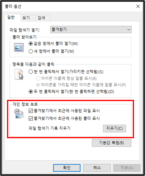 ▲누르면 폴더 옵션 창이 뜬다. 아래에 개인 정보 보호에 보면 즐겨찾기에서 최근에 사용된 파일 표시, 폴더 표시가 보인다. 이것이 기본적으로 체크가 되어 있기 때문에 흔적이 보이는 것이다. 이 항목들의 체크를 풀고 더 확실하게 파일 탐색기 기록 지우기까지 해주자.