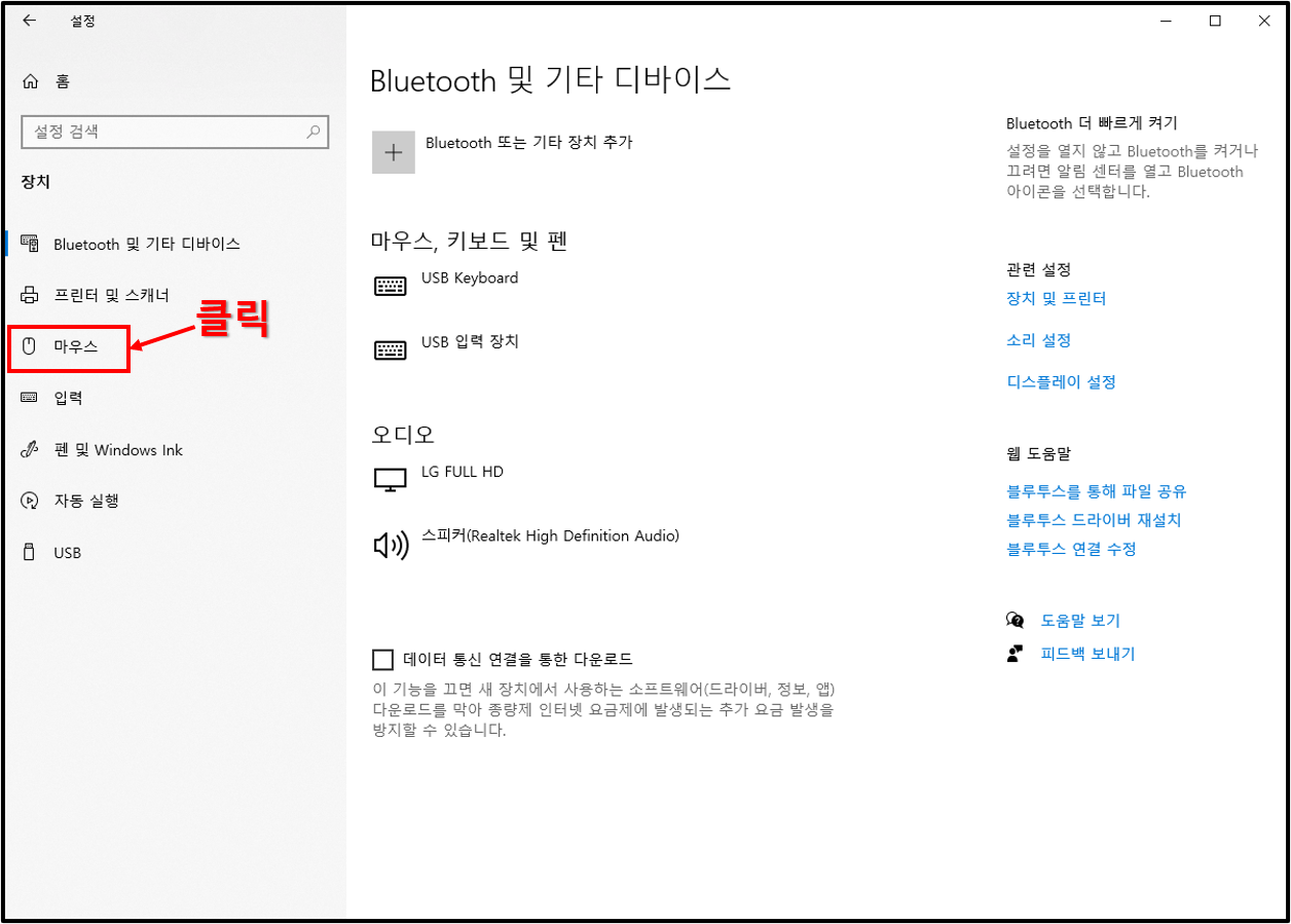 ▲참고로 마우스는 컴퓨터를 구성하는 보조 장치 중의 하나이다. 이 말을 하는 이유는 마우스는 결국 장치라는 말이다. 장치를 눌러주자. 친절하게 장치 밑에 적힌 글에 마우스라고 떡 하니 적혀있다.