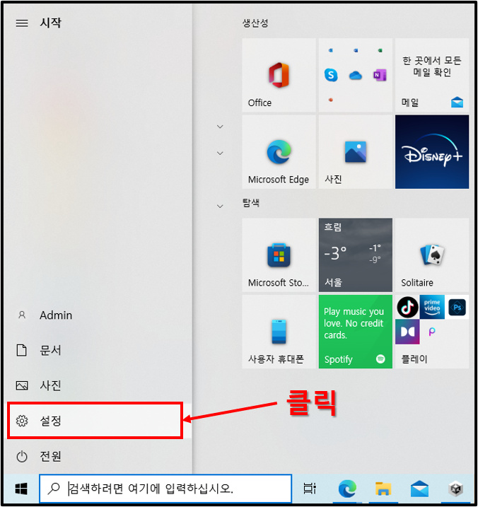 ▲시작 버튼을 누른 후 옆에 보이는 설정을 클릭하여 들어가 주도록 하자.