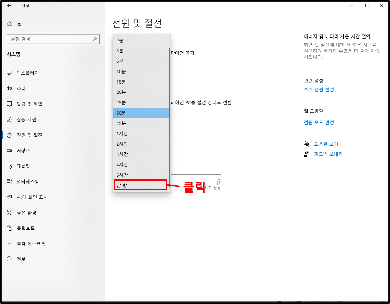 ▲시간 항목을 누르면 맨 밑에 안 함이라는 글자가 보인다. 말 그대로 절전 모드를 안쓰겠다는 말이다. 화면의 시간과 절전 모드의 시간을 안 함으로 설정하면 더 이상 컴퓨터에서 절전 모드는 사용되지 않는다.