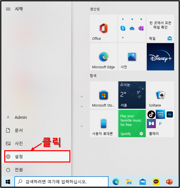 ▲우선 시작 버튼을 누른 후 설정으로 들어가자.