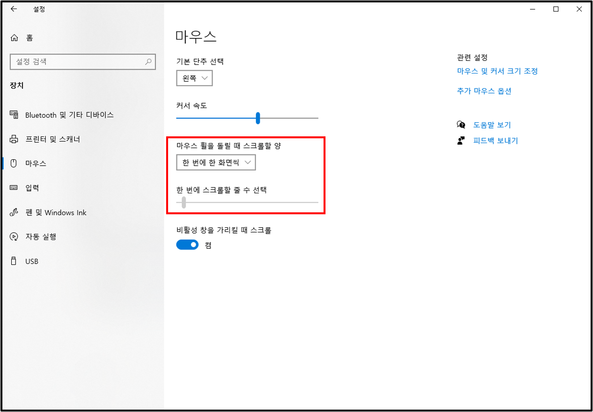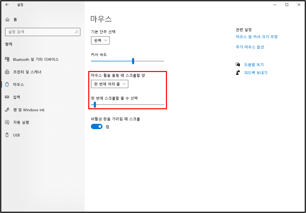 ▲빨간 박스 안에 마우스 휠 속도를 조절할 수 있는 항목이 있다. 직접적으로 마우스 휠 속도라고 적혀있지는 않지만 한 번에 스크롤할 수 있는 줄 자체가 마우스 휠 속도를 말한다고 보면 된다. 동 시간에 스크롤하는 줄의 수가 늘어나니 당연한 것이다. 마우스 휠의 속도를 구체적으로 설정하고 싶다면 "한 번에 여러 줄"로 설정된 상태에서 한 번에 스크롤할 줄 수를 늘리면 된다. 적당히 늘리자. 정말 상상을 초월할 정도로 속도가 빨라지기 때문이다.