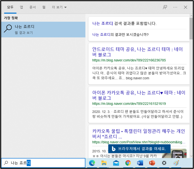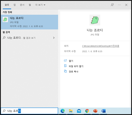 ▲다시 나는 죠르디를 검색하니 웹 검색 결과만 옆에 나오게 되고 좀 전에 검색되었던 내 컴퓨터 속의 나는 죠르디 파일은 검색이 되지 않는 것을 볼 수 있다.