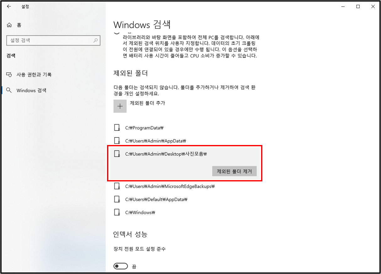 ▲다시 검색이 되게 하고 싶다면 제외된 폴더 목록의 사진모음을 클릭하여 제외된 폴더 제거를 누르면 된다. 본인만이 보고 싶거나 실행하고 싶은 파일 등이 있다면 이 기능을 적극적으로 사용하도록 하자.
