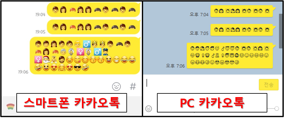 ▲컴퓨터와 모바일 간의 차이도 있다. 같은 이모지를 입력하였는데 스마트폰 카카오톡에서 보이는 것과 PC 카카오톡에서 보이는 것이 좀 다르다. 결론은 입력하는 곳이 어디냐에 따라 나타나는 방식이 다소 차이가 있기 때문에 미리 한번 시범적으로 입력해보고 어떻게 나오는지 한 번 확인한 후에 사용하는 것을 추천한다.