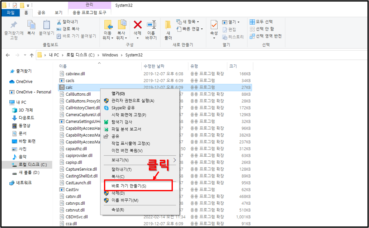 ▲calc파일을 누른 후 우클릭을 하여 바로 가기 만들기를 누르면 아이콘을 만들 수 있다.