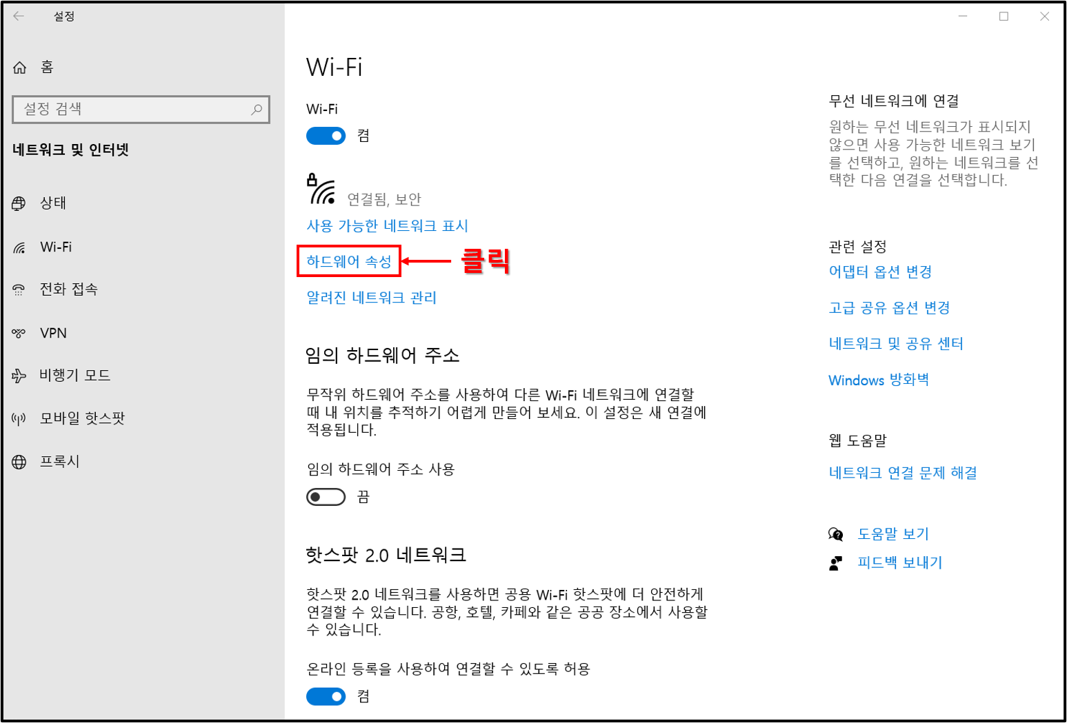 ▲와이파이 컴퓨터를 사용하는 경우, 왼쪽의 와이파이 항목을 클릭한 뒤, 오른쪽에 보이는 하드웨어 속성을 눌러주도록 하자.