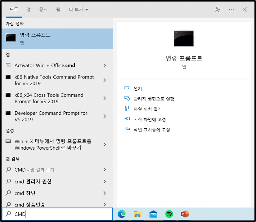 ▲검색창에 CMD를 입력하면 명령 프롬프트라는 앱이 나온다. 이것을 실행하도록 하자.