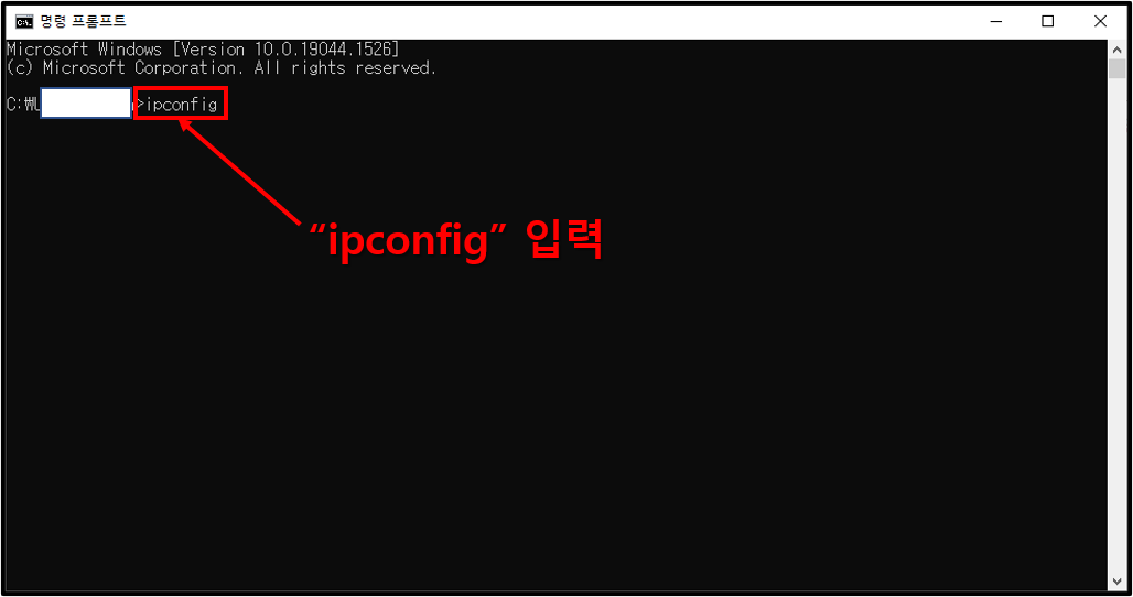 ▲실행하고 창이 뜨면 "ipconfig"를 입력하고 엔터를 누르자.