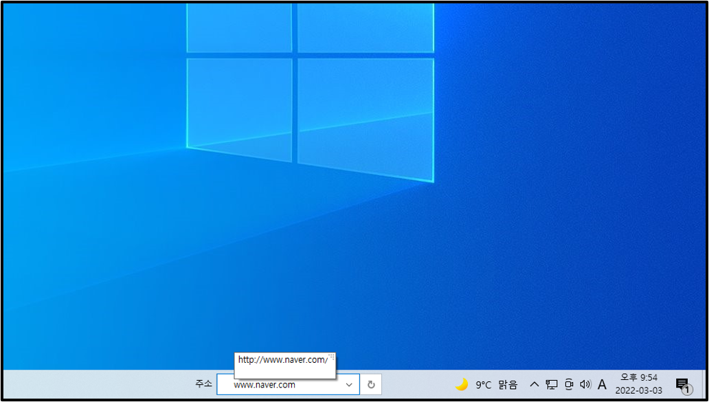 ▲시작 단추부터 시작해서 검색창도 있고 시간 및 날씨도 표시할 수 있을뿐더러 여러 가지 프로그램의 바로가기 단추도 있다. 특별하게 설정을 변경하지 않았다면 윈도우10을 사용하는 많은 사람들의 작업표시줄은 이와 크게 다르지 않을 것이다. 좀 달라 보이게 특별한 설정을 하나 해보자. 이번 글에서는 작업표시줄에 주소창을 추가하는 방법에 대하여 알아보도록 하겠다.