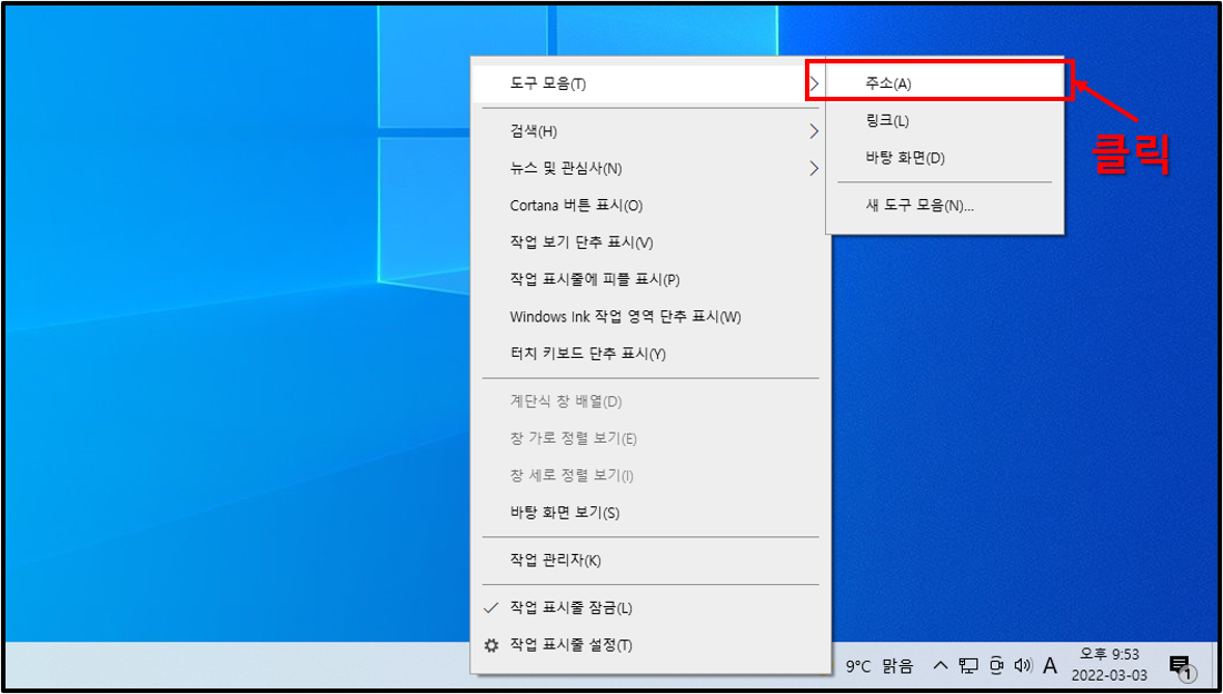 가장 먼저 작업표시줄의 빈 공간에 마우스 우클릭을 하여 팝업창을 띄워주도록 하자.