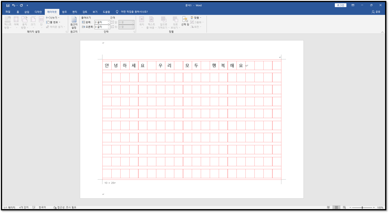▲확인을 누르면 우리가 익히 잘 알고 있는 원고지가 완성된다. 완성된 기념으로 문장을 하나 입력해보도록 하자.