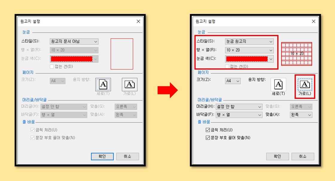 ▲누르면 눈금, 페이지 등을 설정할 수 있는 창이 나온다. 설정을 오른쪽과 같이 바꿔주도록 하자. 그리고 확인을 누르자.