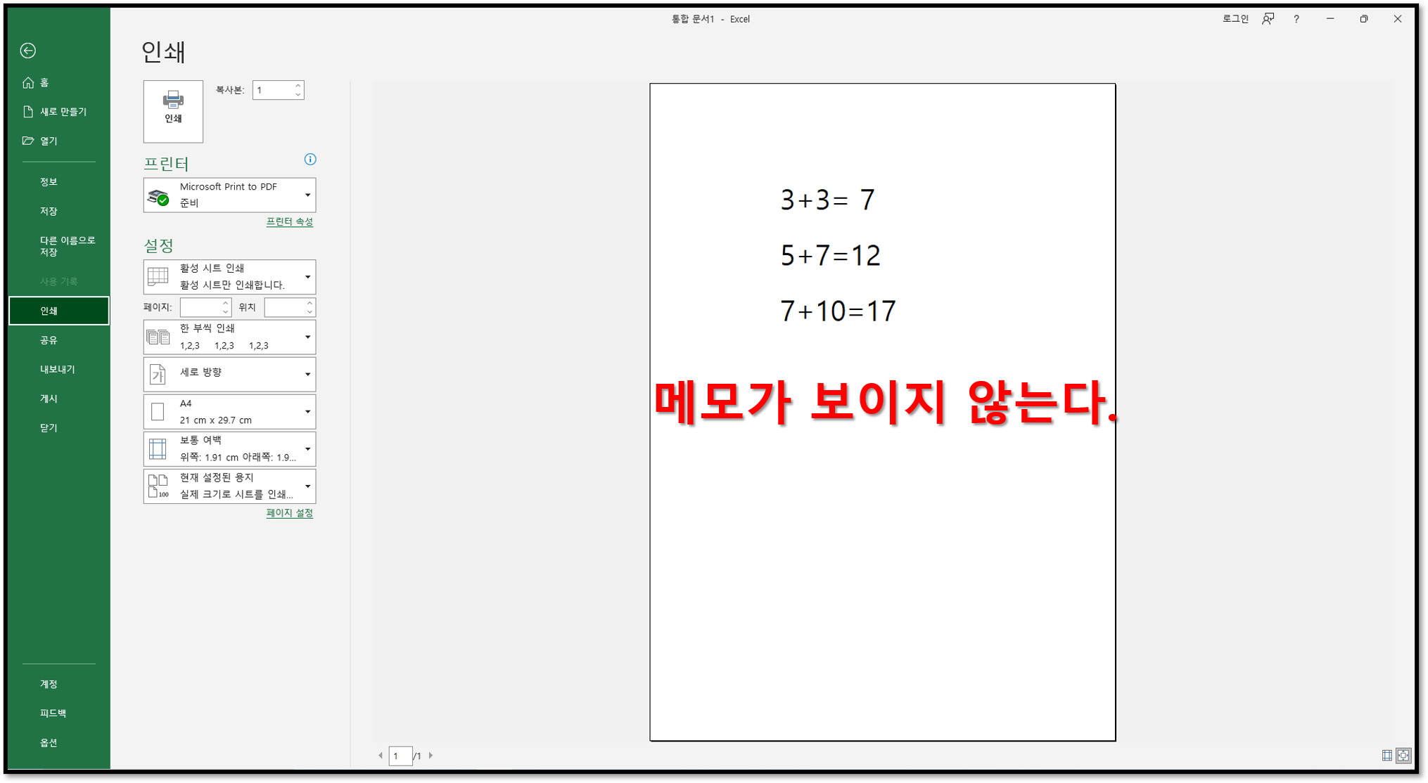 ▲엑셀 안에 간단한 계산이 적혀있다. 그런데 3+3이 7이라는 오답을 적어놔서 정답은 6이라고 메모에 적어놨다. 근데 이것을 프린터를 하려고 하니......
