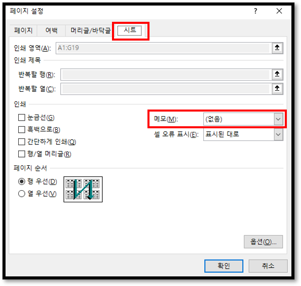 ▲페이지 설정 창이 나오는데 시트를 클릭하자. 그리고 메모를 클릭해보자. 현재 (없음)으로 설정되어있다.