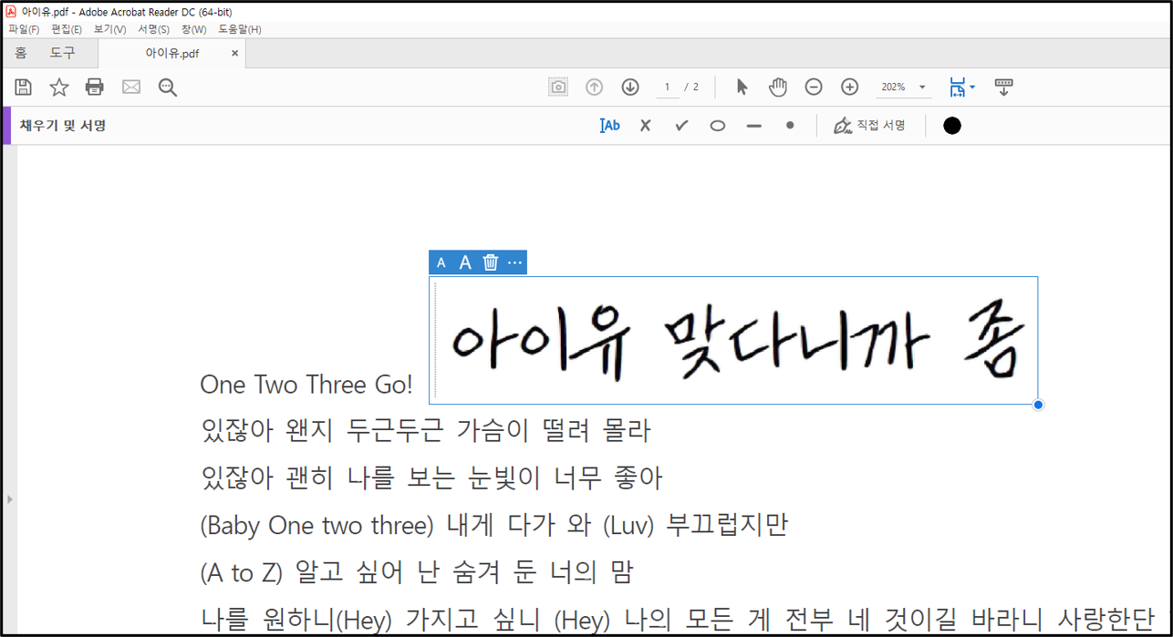 ▲확실히 필자가 마우스로 쓴 글자보다 프로그램으로 글자를 만든 게 훨씬 이쁜 것 같다. 아무튼 이렇게 쉽고 간단하게 서명을 만들어 사용할 수 있다. 회사 업무를 한다면 반드시 PDF 서명을 사용하는 경우가 생길 것이다. 잘 알아두도록 하자.