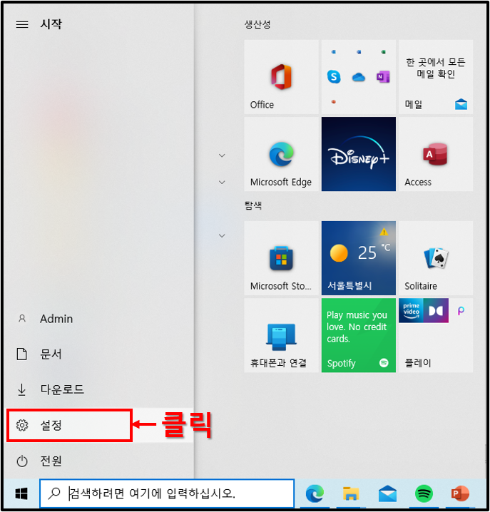 ▲시작 버튼을 누른 후 설정을 클릭하도록 하자.