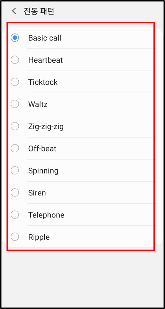 ▲여러 가지 영어 이름의 진동 패턴이 있다. 우리가 일반적으로 겪는 진동은 Basic call이라는 이름으로 불린다. 다양한 진동 패턴이 있으니 하나씩 눌러보고 마음에 드는 것을 선택하면 되겠다.
