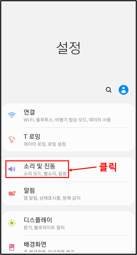 ▲설정에 들어간 후, 소리 및 진동을 터치하도록 하자.