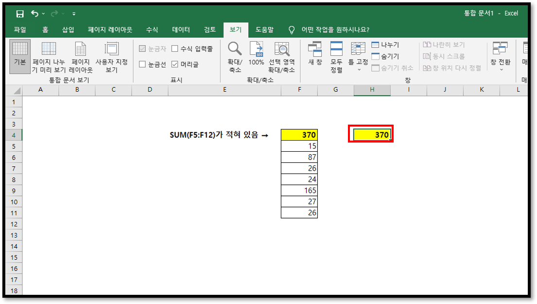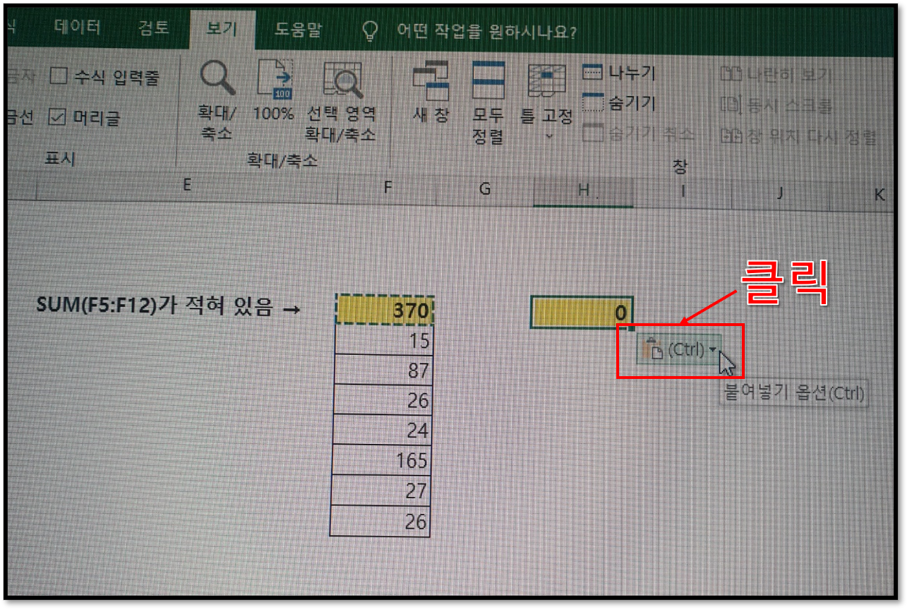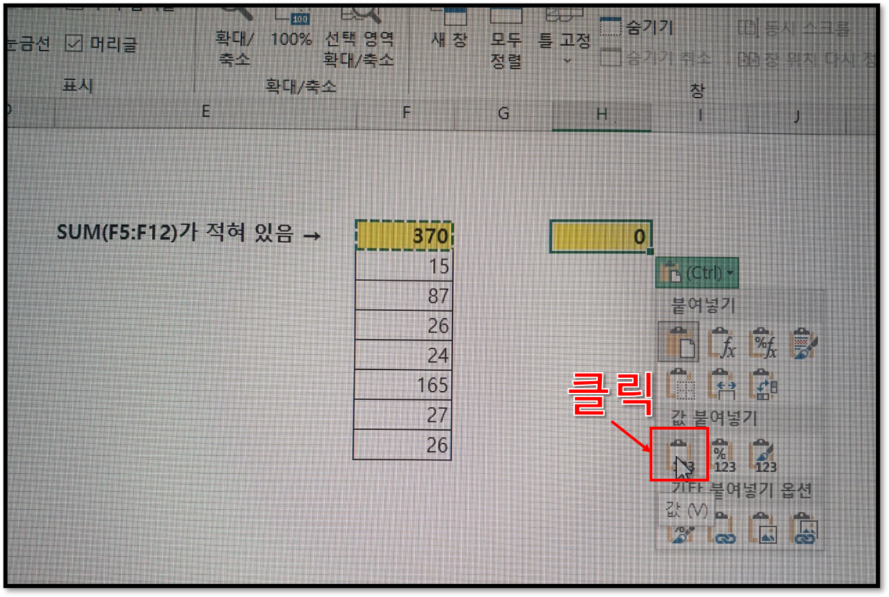 ▲띠용? 370이 아닌 0이 나온다. 당연하다. 수식이 같이 따라오니까. 위치이동을 했으니 복사한 칸에는 SUM(H5:H12)가 입력되어 있다. 이 구간에는 숫자가 적힌게 없으니 당연히 0이 나오는 것이다. 그럼 어떻게 값만 복사할까?