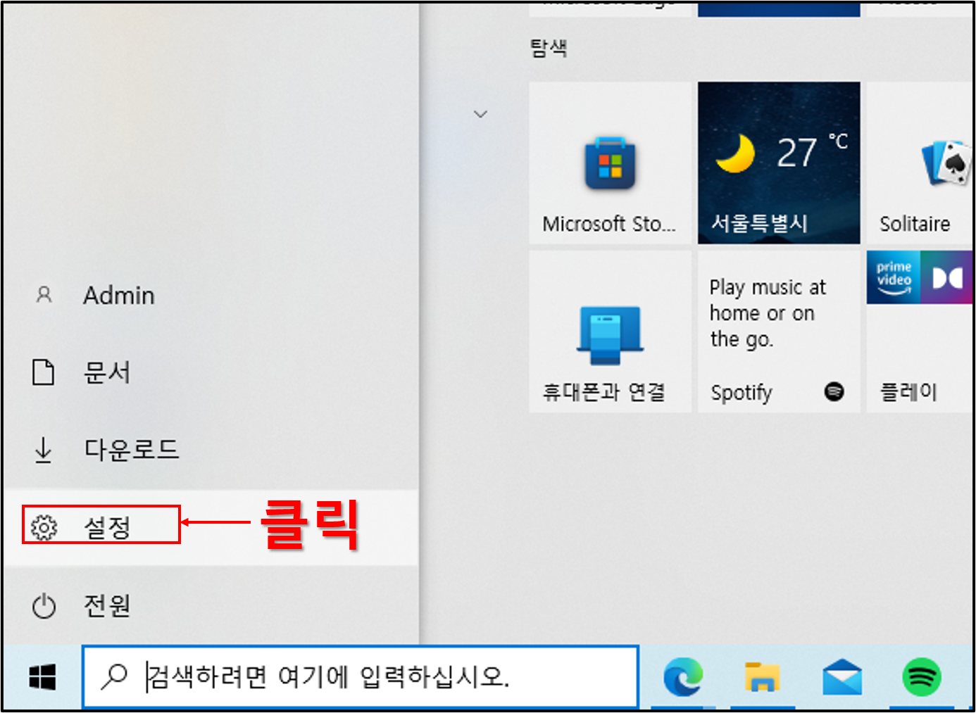 ▲시작 버튼을 누른 후 설정을 클릭하도록 하자.