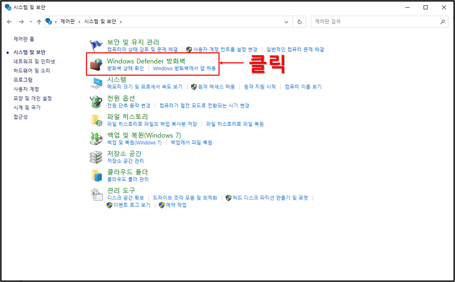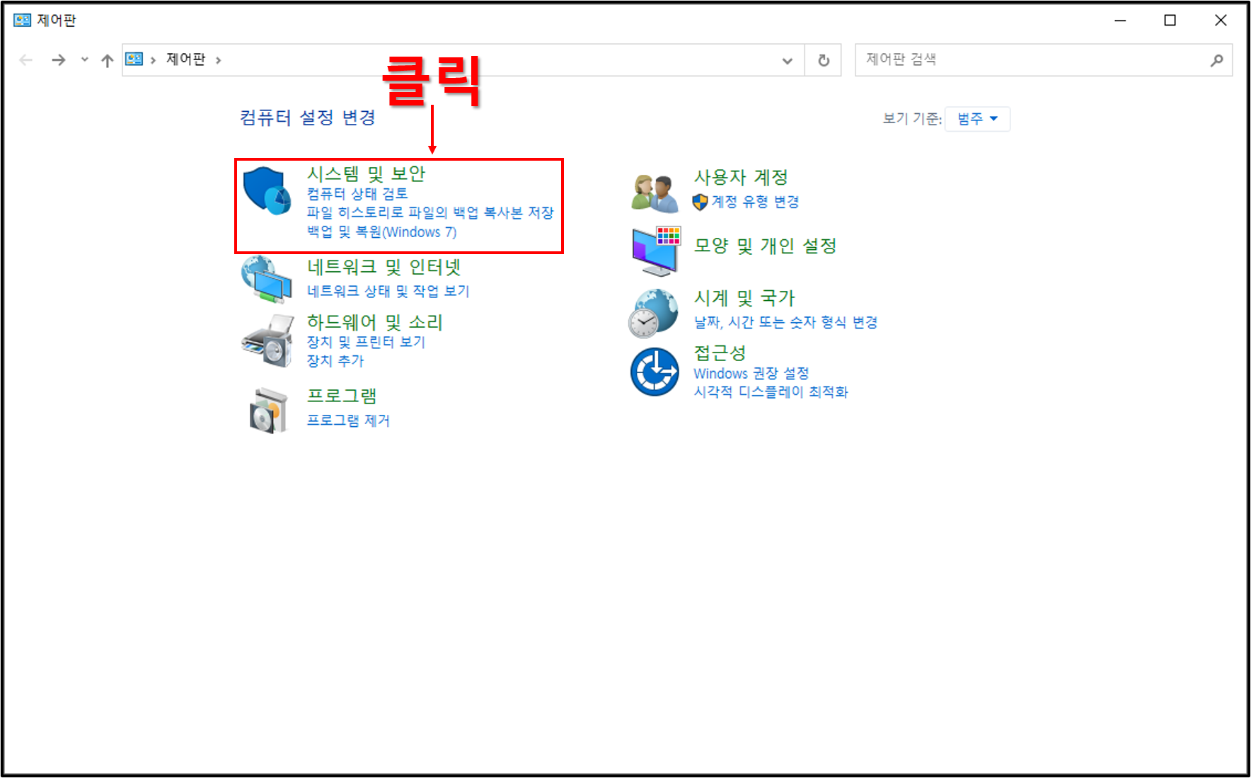 ▲앞서 언급하였지만 윈도우 디펜더는 컴퓨터에 해로운 것을 막아주는 역할을 한다. 그렇다면 딱 봐도 시스템 및 보안으로 들어가야 되지 않겠는가? 시스템 및 보안을 클릭하도록 하자.