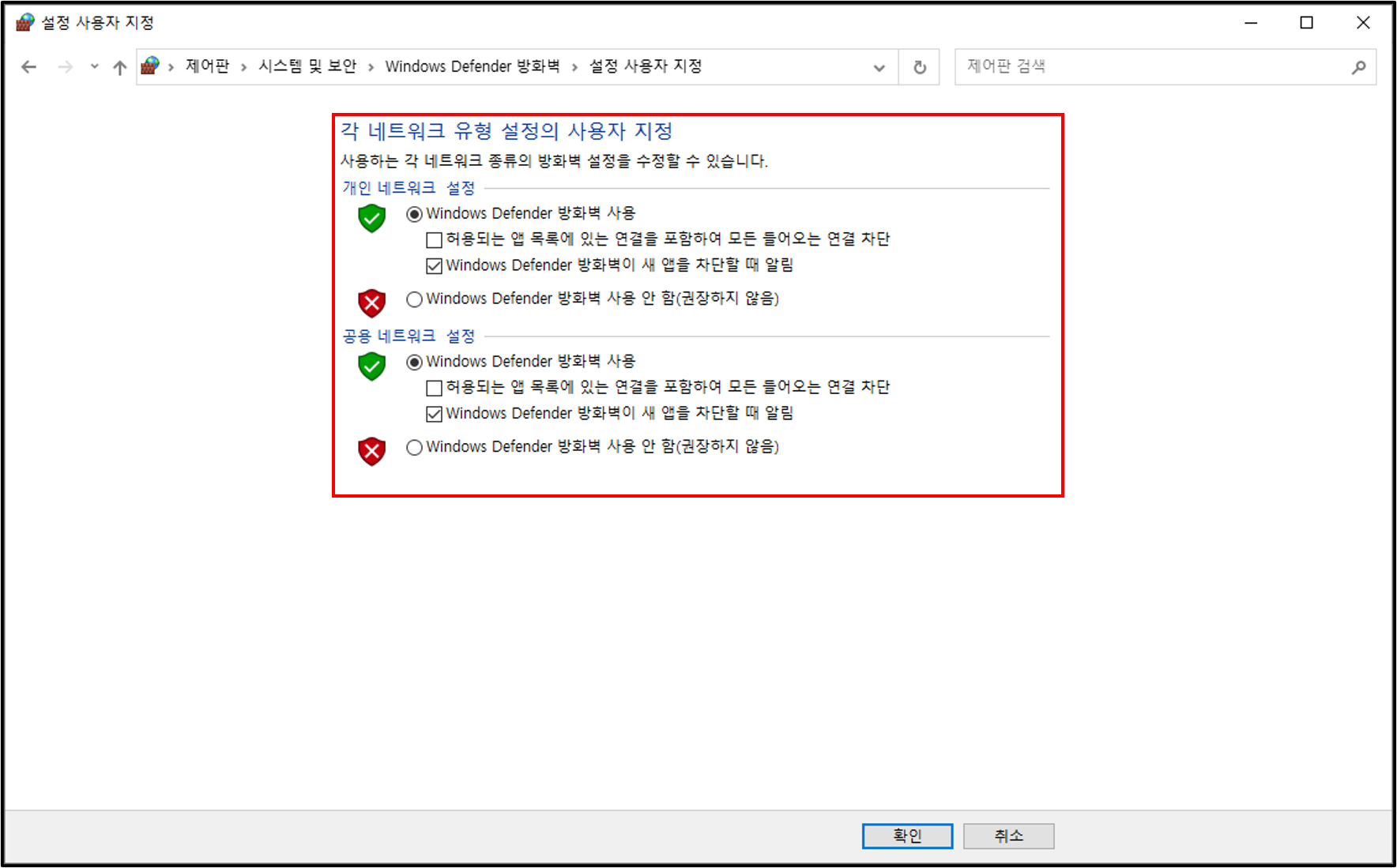 ▲기본적으로 윈도우 디펜더는 켜져 있다. 여기서 이제 윈도우 디펜더 방화벽 사용 안 함을 체크하면 꺼진다. 필요한 파일을 다운로드했다면 반드시 윈도우 디펜더를 다시 켜도록 하자.