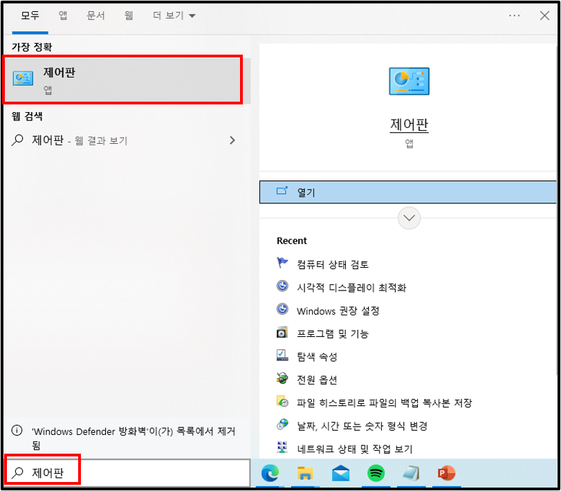 ▲간단하게 작업 표시줄 검색창에 제어판을 입력하면 바로 들어갈 수 있다. 들어가자.