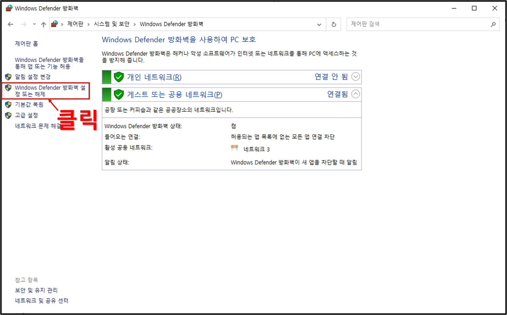 ▲누르면 왼쪽 편에 뭐 여러가지 항목이 보인다. Windows Defender 방화벽 설정 또는 해제를 클릭하도록 하자.