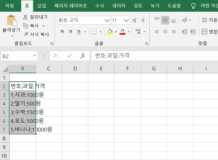 우선 나누려는 텍스트가 적힌 셀을 드래그 하자. 위 사진에서는 B열에 2행에서 7행까지 텍스트가 입력이 되어있다.