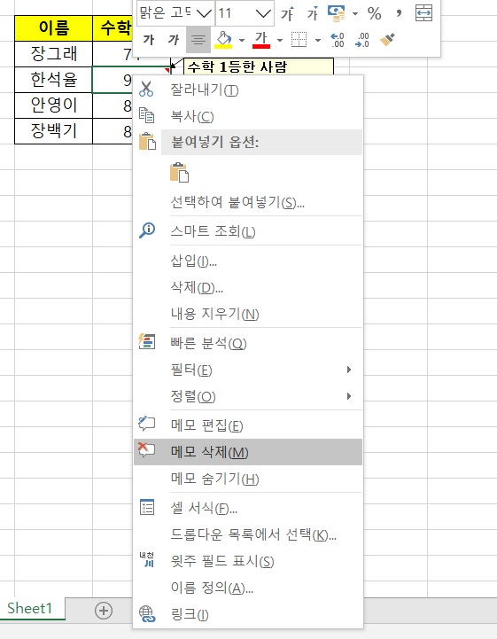 다시 마우스 우클릭을 하자. 밑으로 내려가면 메모 삭제라는 항목이 있다. 이것을 누르면