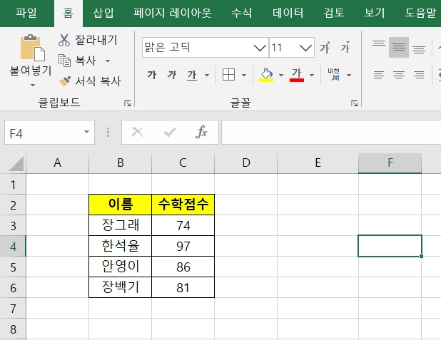 사진의 표는 4명의 학생이 수학시험을 쳐서 나온 수학 점수이다. 딱 봐도 한석율이 수학시험 1등을 차지했다는 것을