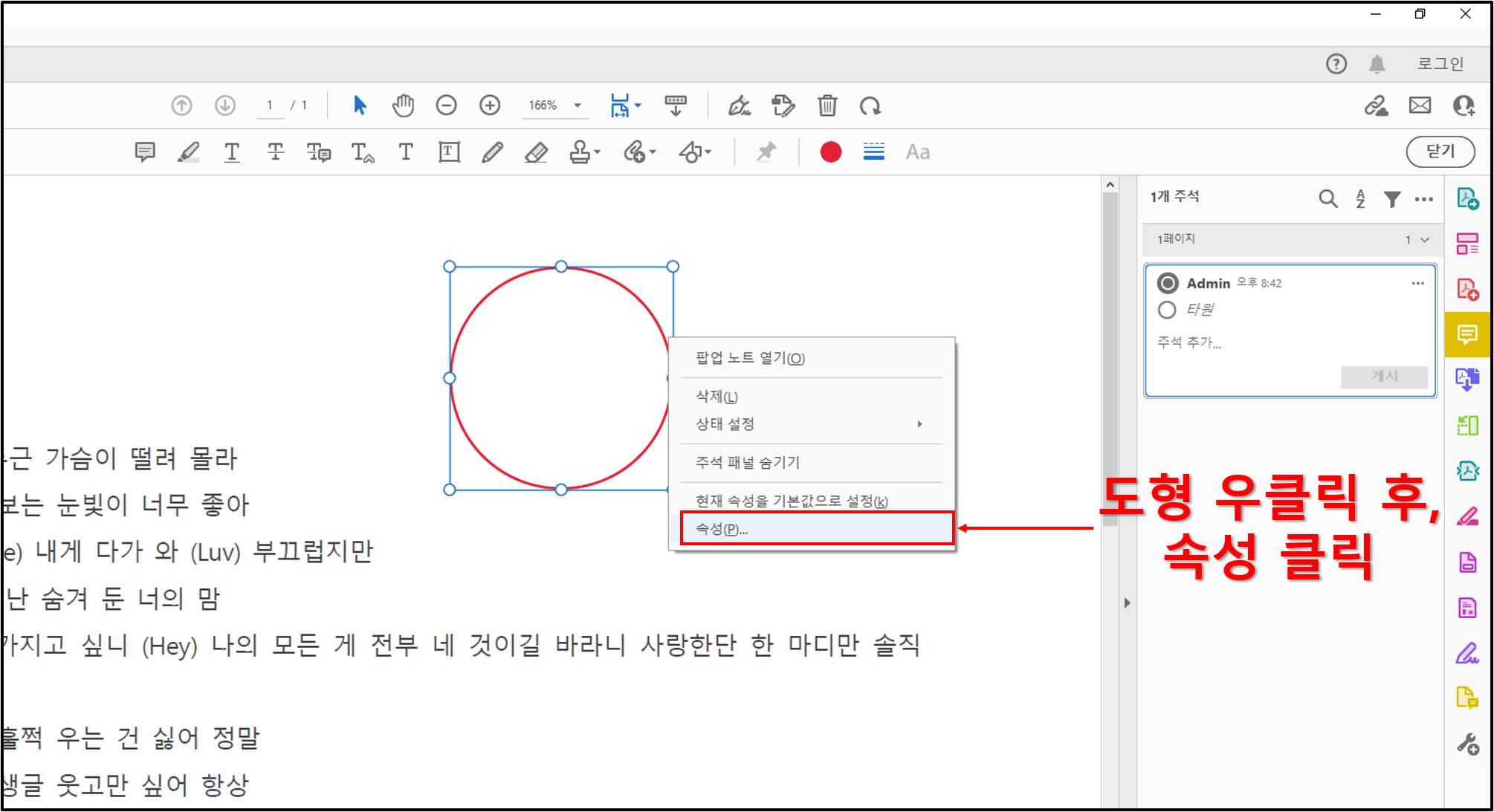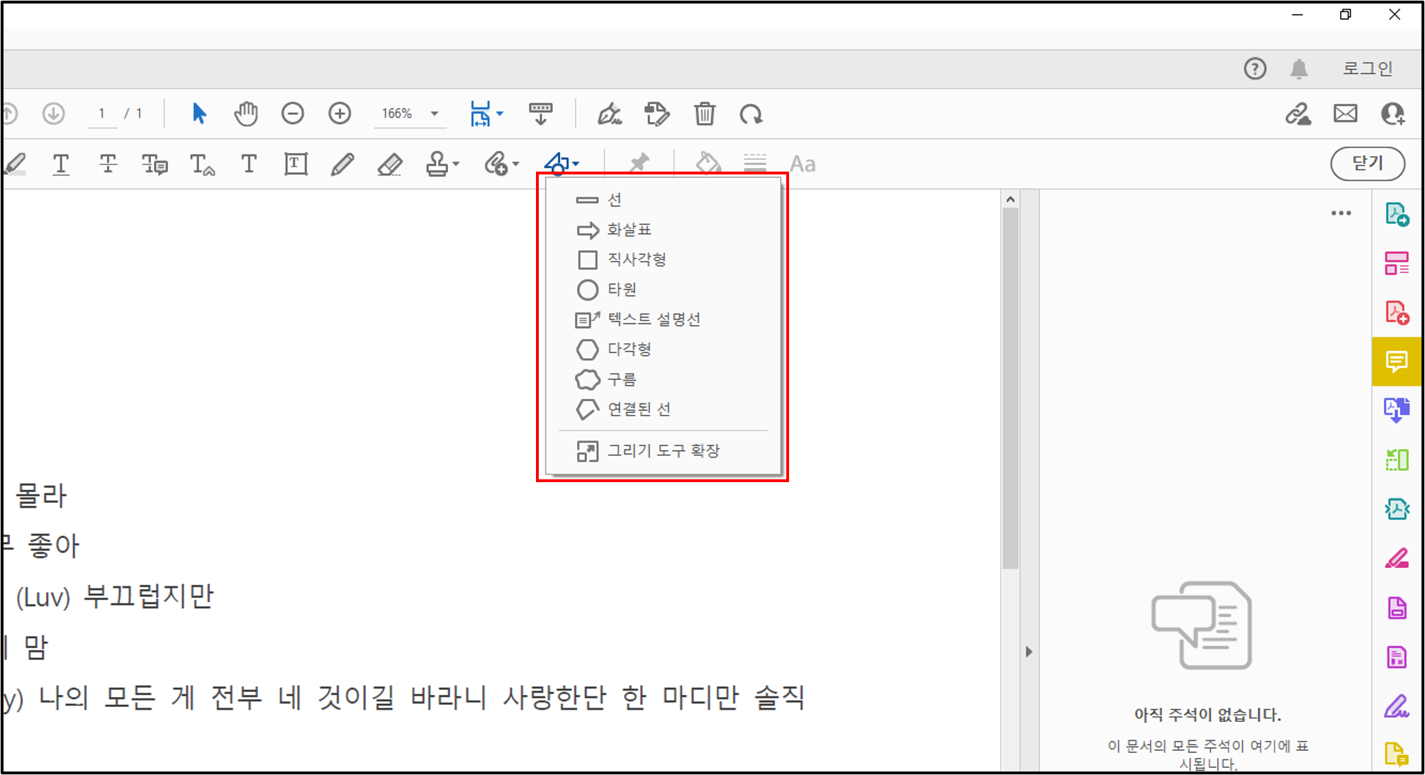 ▲PDF문서에 오른쪽 편을 보면 주석이라는 게 보일 것이다. 주석을 클릭하도록 하자.