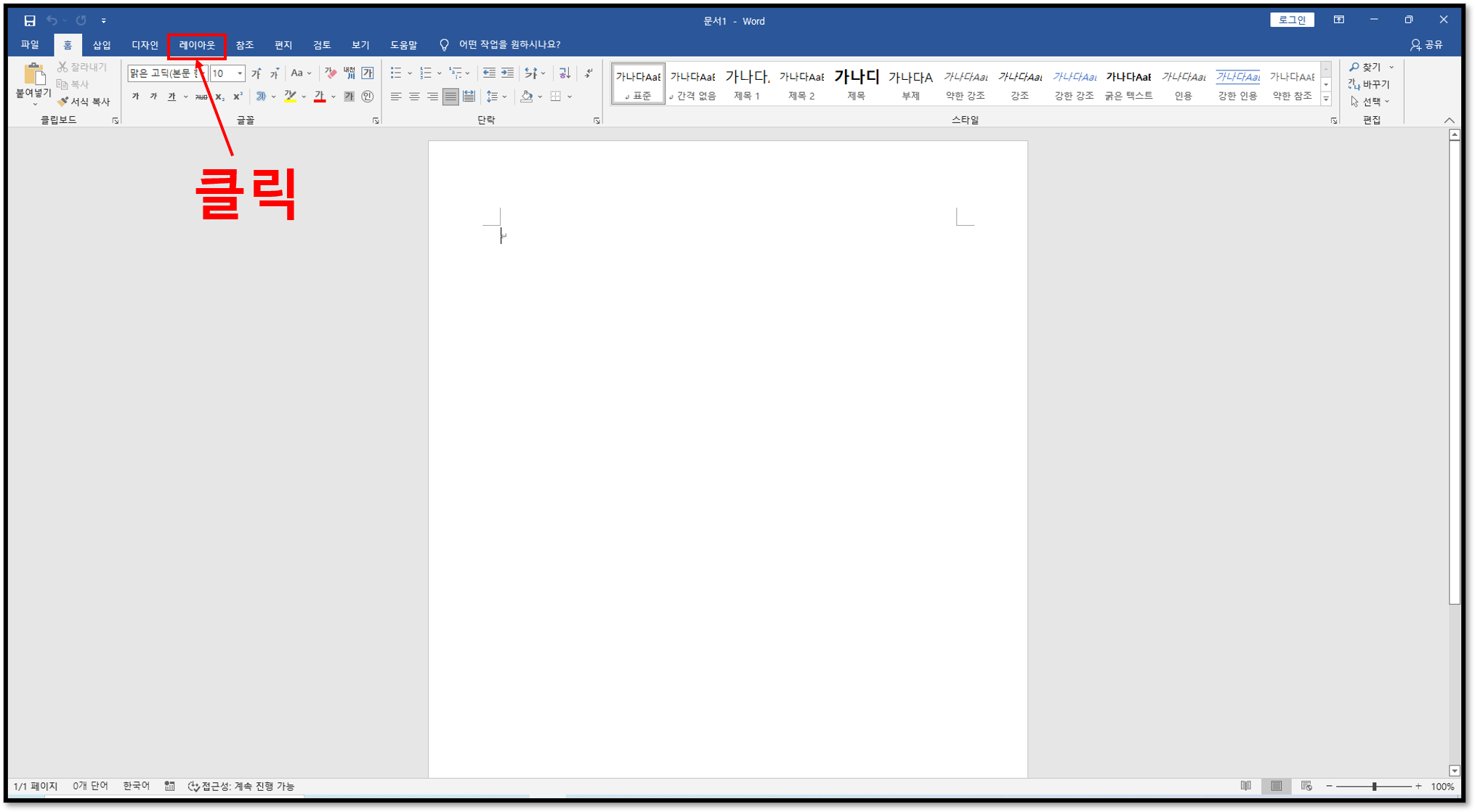 ▲워드 화면 상단 메뉴에 레이아웃이라는 항목이 있다 이것을 클릭하도록 하자.