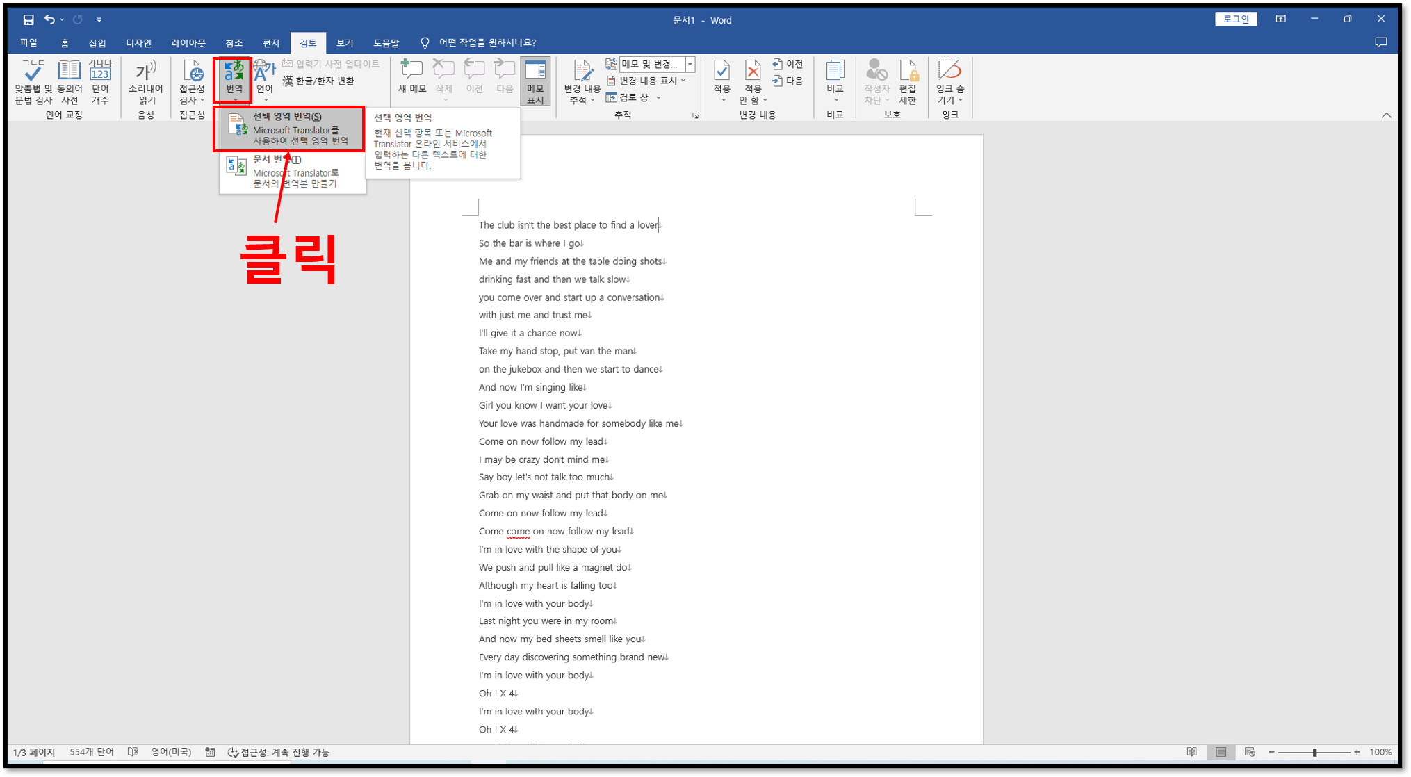 ▲해당 문서의 내용은 Ed sheeran - Shape of you라는 노래의 가사다. 빌보드 1위를 먹었을 정도로 정말 인기가 많은 곡이다. 이 노래의 가사를 번역하자. 상단 메뉴에서 검토를 클릭하도록 하자.