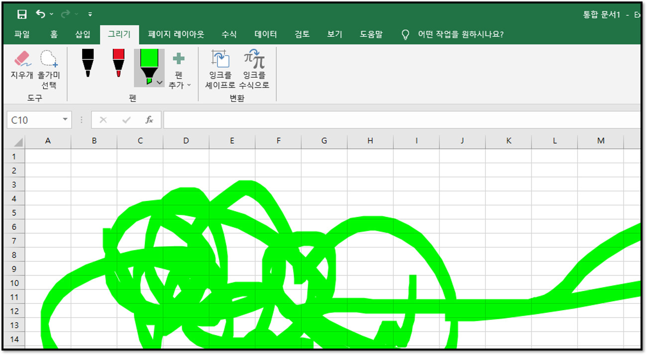 ▲다시 엑셀 화면으로 돌아가면 리본 메뉴에 그리기가 생긴 것을 볼 수 있다. 어렵지 않다. 그리기를 클릭하고 펜 모양을 클릭하면 두께, 색깔 등을 지정할 수 있다. 지정 후 오른쪽에 보이는 것과 같이 슥슥 그리면 된다.
