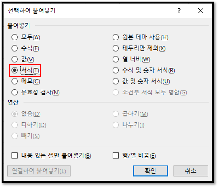 ▲누르면 선택하여 붙여넣기라는 창이 뜬다. 여기서 서식 항목에 체크를 하고 확인을 클릭하면 된다.