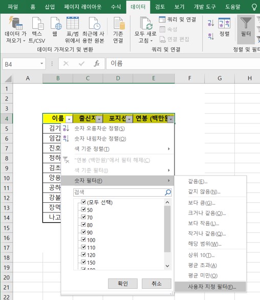 숫자 데이터에 간단한 조건을 걸어서 데이터를 추출할 수도 있다. 숫자 데이터가 있는 연봉(백만원) 옆의 화살표를 눌러 숫자 필터에 들어가면 뭐 이것저것 나오는데 여기서 사용자 지정 필터를 누르자.