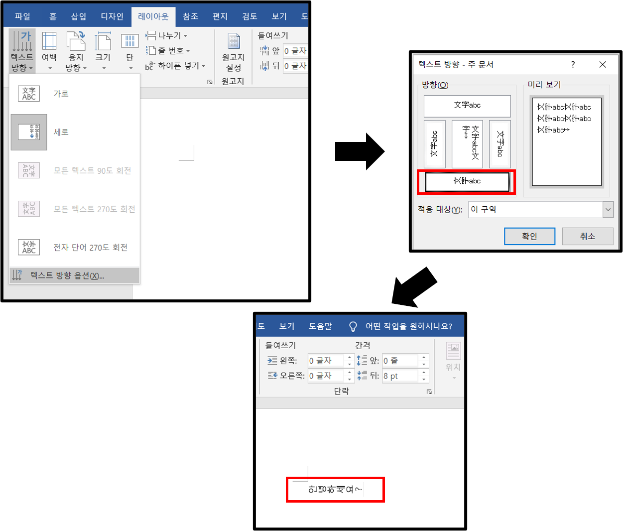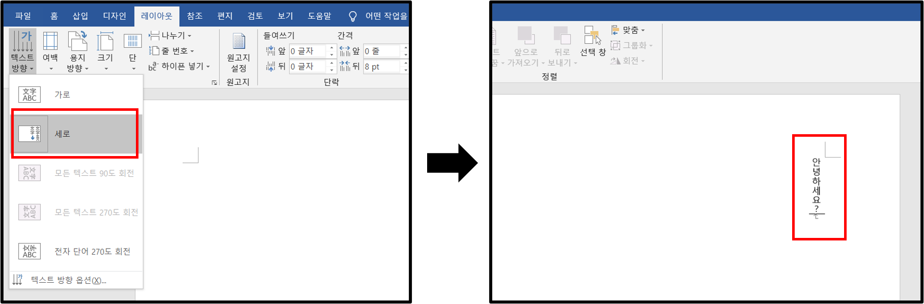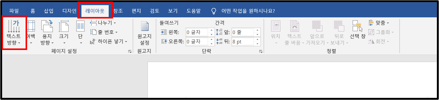 ▲상단의 레이아웃을 누른 뒤, 가장 왼쪽에 있는 텍스트 방향을 클릭하자.