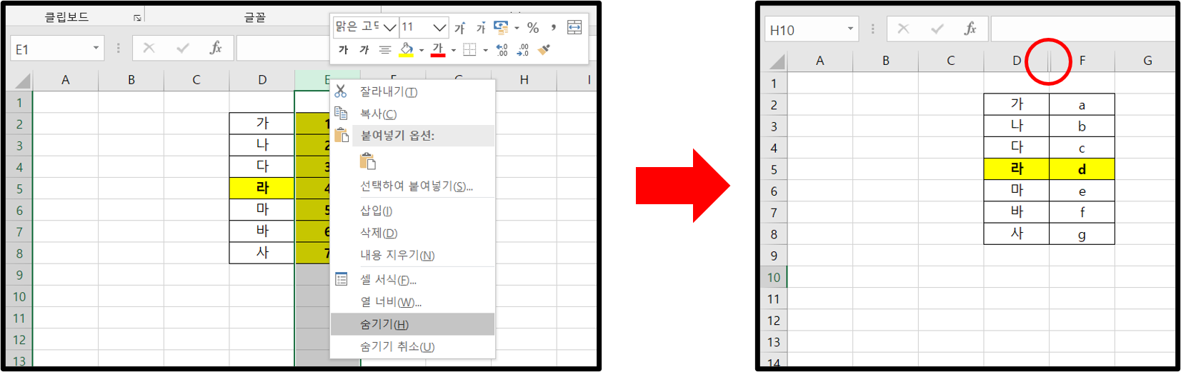 열을 숨기고 싶다면 숨기고 싶은 열을 마우스 오른쪽으로 클릭하자. 클릭하면 왼쪽 사진처럼 뭐 여러 가지가 나오는데 밑에 숨기기(H)가 보일 것이다. 이것을 클릭하면 오른쪽 사진처럼 E열이 사라져 있다. 정확하게 말하면 사라진 것은 아니고 보이지 않을 정도로 해당 열의 크기가 작아져 있는 것이다. 숨겨진 열은 빨간색 동그라미 안처럼 이중선으로 나타난다.