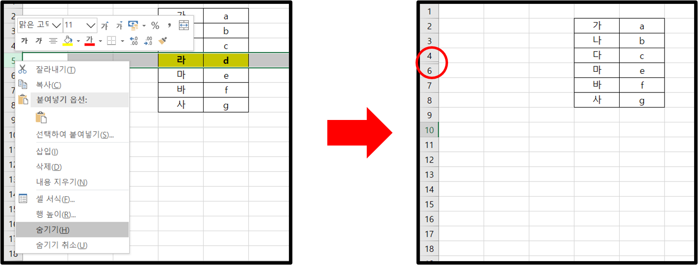 행을 숨기는 방법도 열을 숨기는 것과 다르지 않다. 행을 숨기고 싶다면 숨기고 싶은 행을 마우스 오른쪽으로 클릭하고 마찬가지로 숨기기를 누르면 행이 사라져 있다. 역시 숨겨진 행은 이중선으로 나타난다.