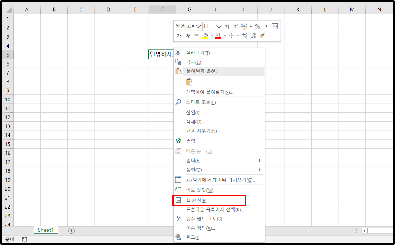 텍스트가 입력된 셀을 우클릭을 하면 여러가지 항목이 나온다. 텍스트의 방향을 바꾸기 위해서는 셀 서식을 클릭하자.
